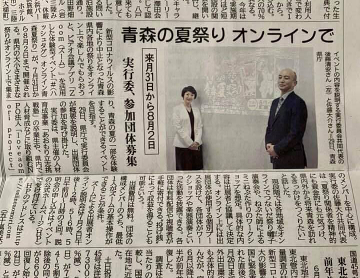 新型コロナウイルスの影響により中止となった青森県内各地の祭りをオンライン上で楽しんでもらおうと、ビデオ会議アプリ「Zoom(ズーム)」を活用した体験型イベント「#(ハッシュタグ)オンライン青森夏祭り」が、7月31日から8月2日に開催される。県内の大小さまざまな祭りがオンライン上で集まり、青森の夏の一部を体験することができるイベントを目指す。
